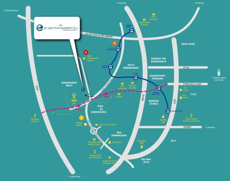 e.Sentral Smart City is situated in Damansara West, offering direct access to major highways such as DASH, NKVE, SPRINT, and GCE. Additionally, the Kwasa Sentral MRT station, along with shuttle and feeder bus services, ensures easy access to public transportation.